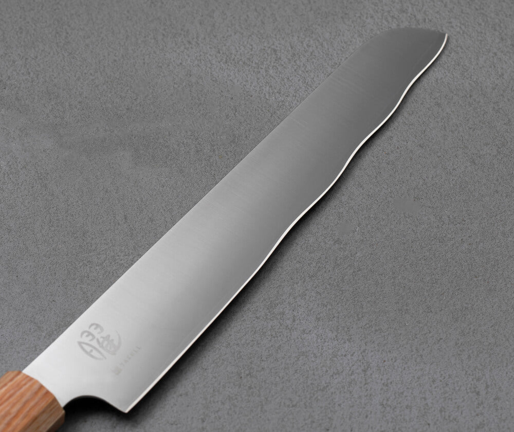 ゆるやかに波うつ「うねり刃」が特長。パンに吸い込まれるような驚きの切れ味です。一般的なギザギザの刃のパン切り包丁と比較して、パン屑がほとんど出ません。