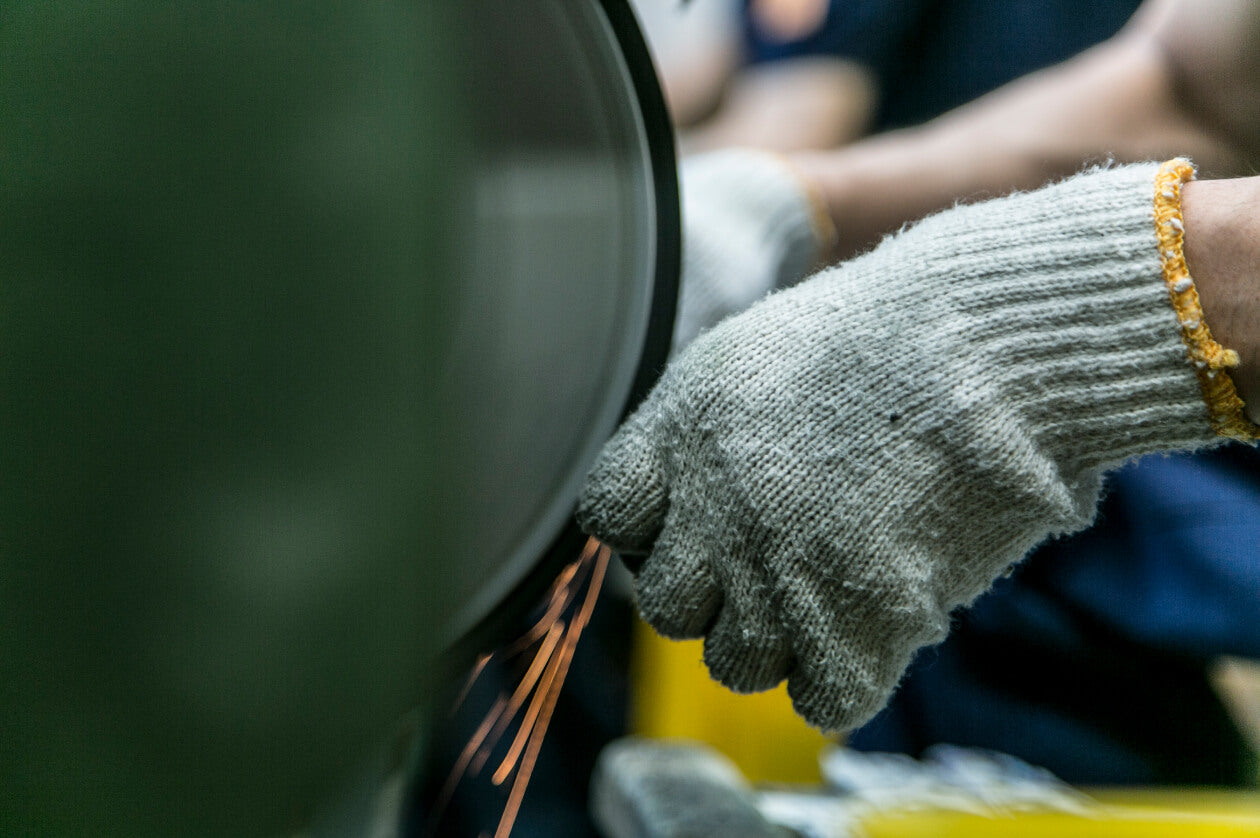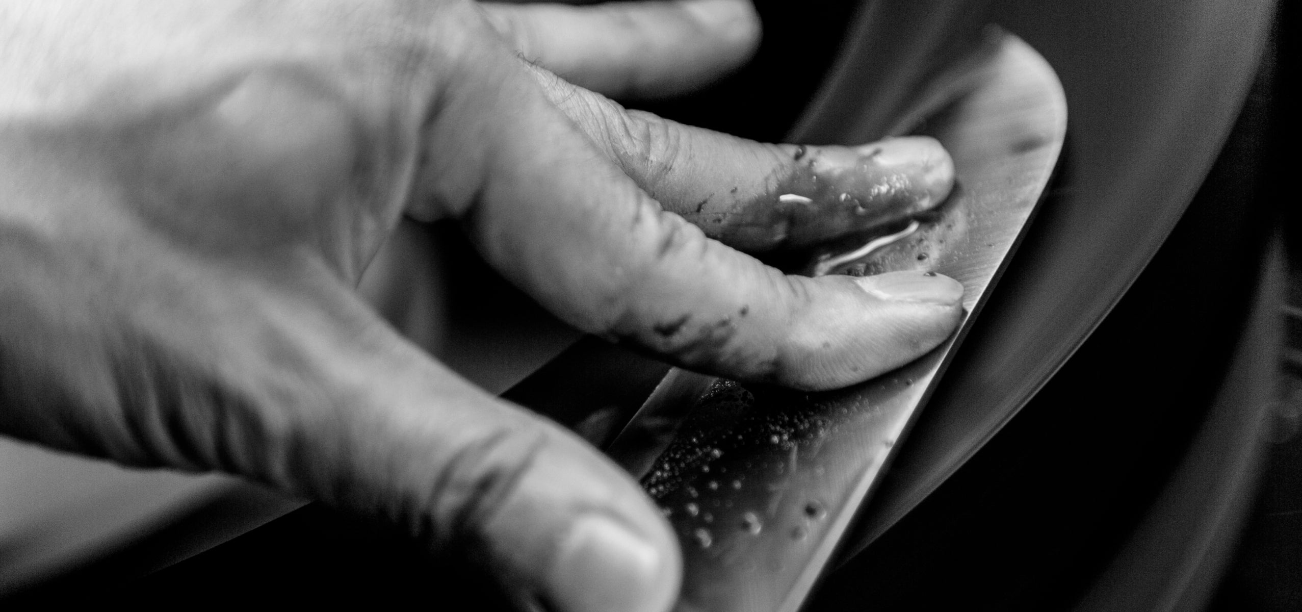 私たちは、熟練の職人による手仕事を大切にしています。たとえば、包丁の刃先を滑らかに研磨する刃付け。熟練した職人が厚さ数ミリの刃を1本1本、手作業で研磨していき、滑らかな切れ味に仕上げています。こうして完成したヤクセルの包丁は使い込むほどに、お客様の手に馴染んでいくことでしょう。