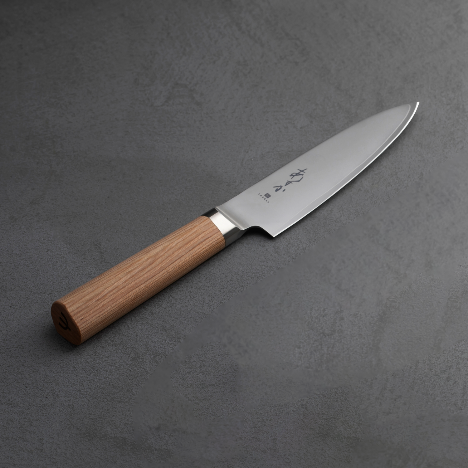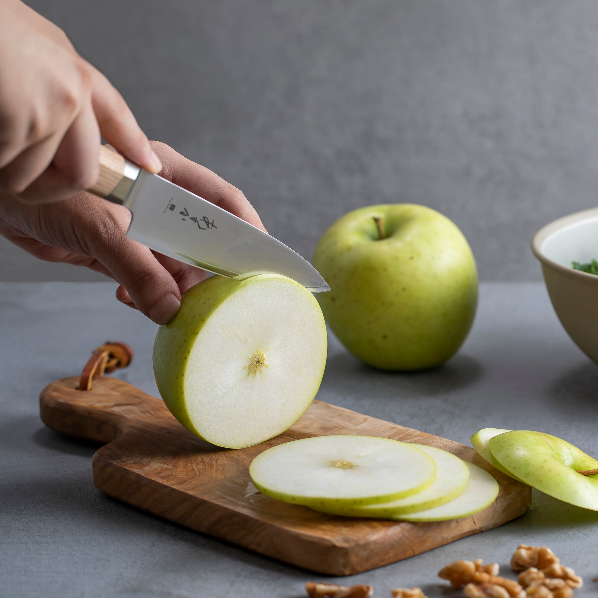 刃渡り13cmのペティナイフ。フルーツなどにはもちろん、小回りがきくので忙しい朝のお弁当づくりや肉・魚を切ることにも使えます。同シリーズで三徳包丁、牛刀もご用意しています