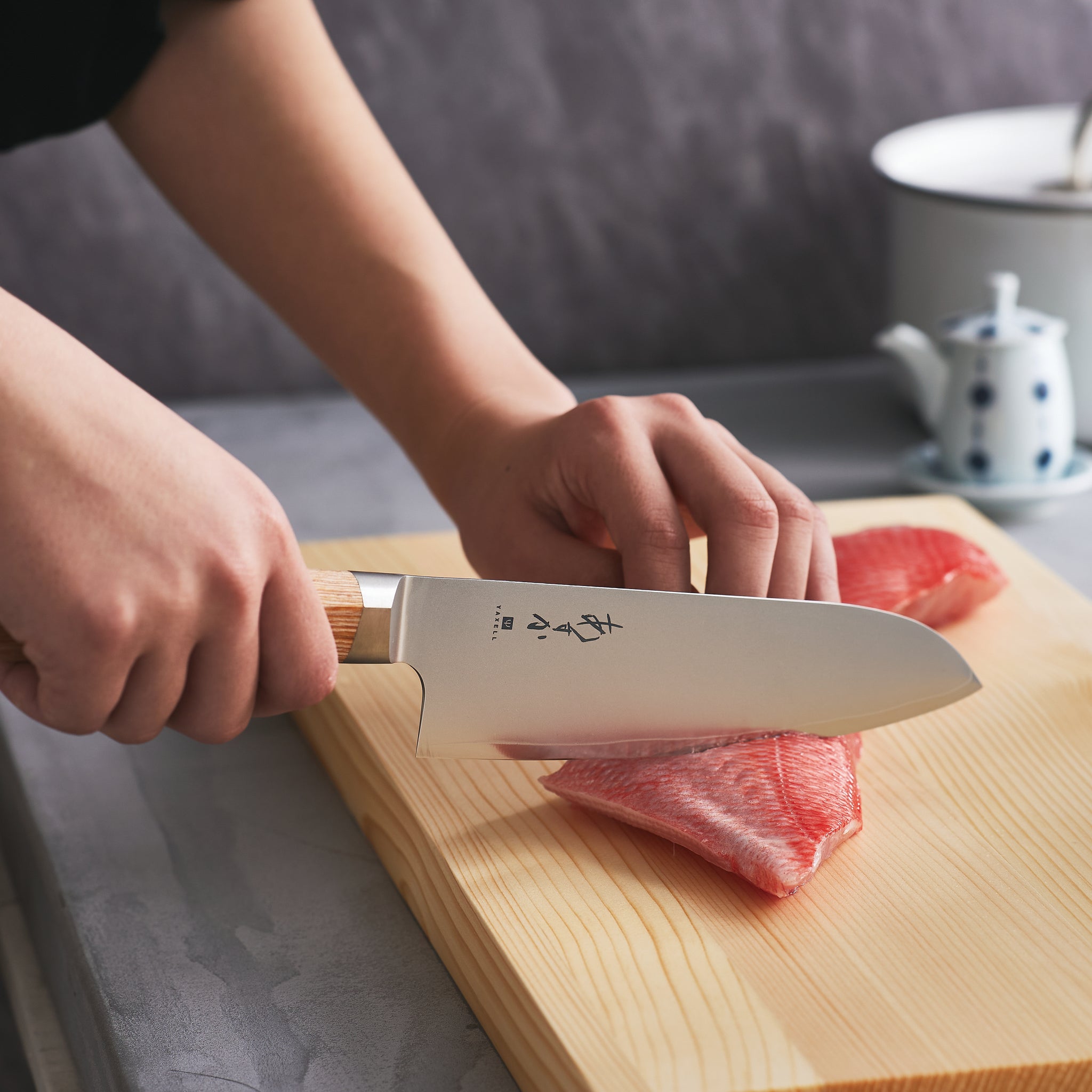 温かみのある白木ハンドルが目を引く「3層鋼」。切れ味はトップクラスながら、機能とデザインをシンプルにすることでコストパフォーマンスのよい包丁に仕上げました。
