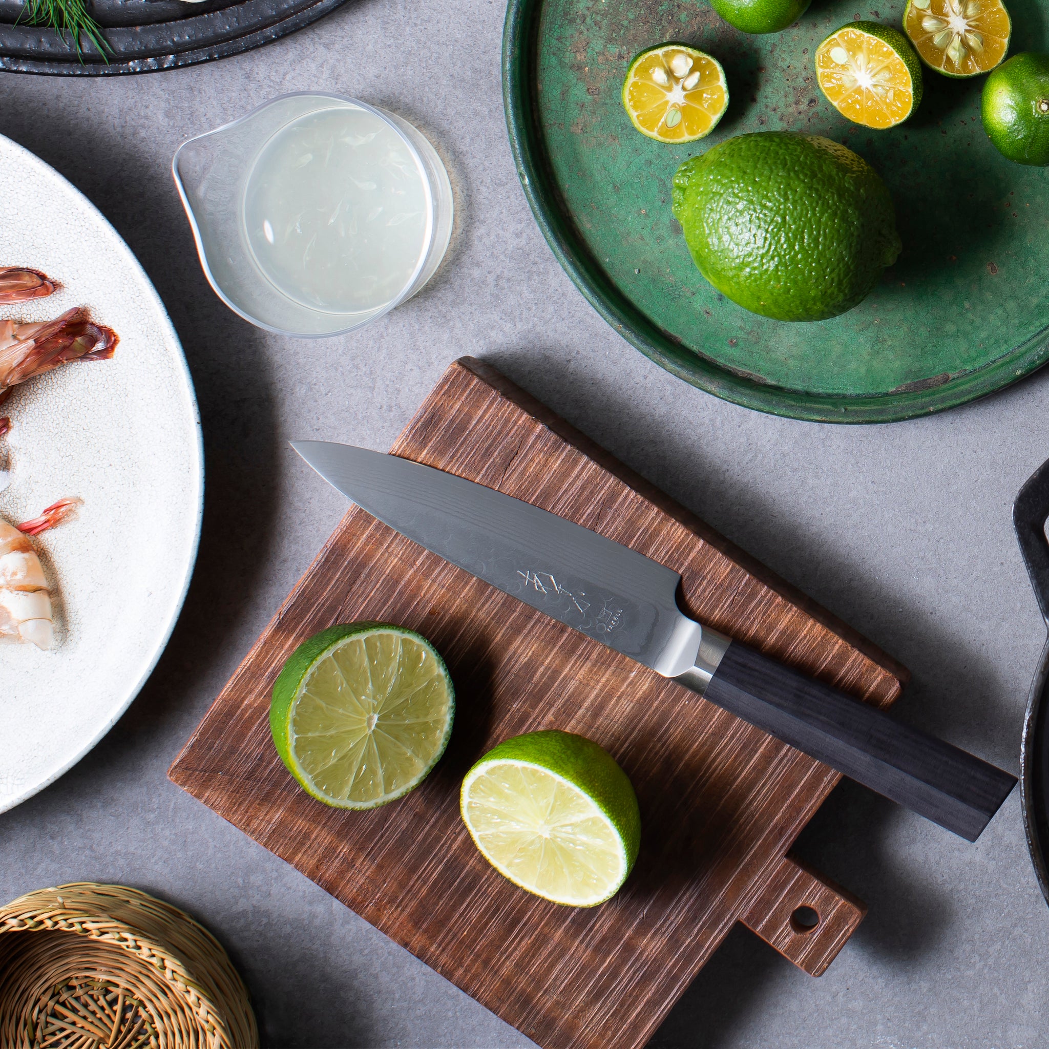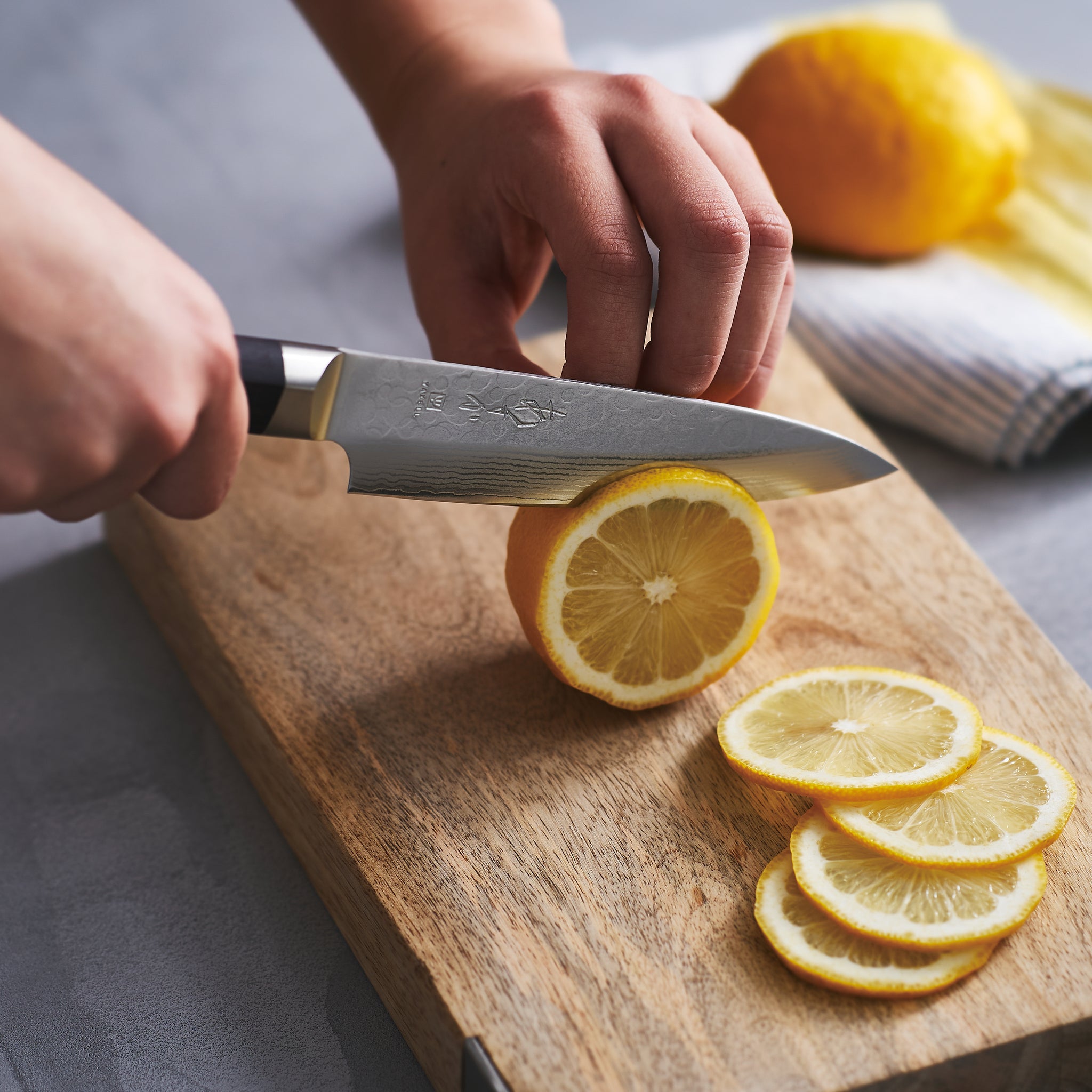 刃渡り13cmのペティナイフ。フルーツなどにはもちろん、小回りがきくので忙しい朝のお弁当づくりや肉・魚を切ることにも使えます。同シリーズで三徳包丁、牛刀もご用意しています。