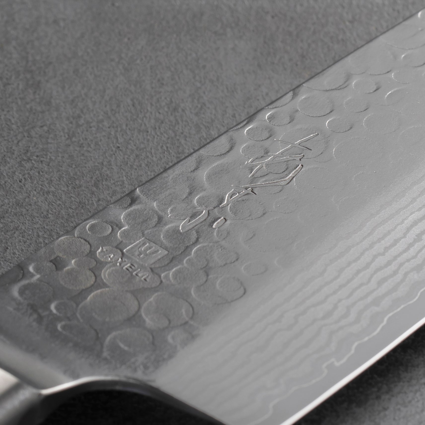 鎚目模様が特長の「37層鋼」。和の要素を感じさせながらも、伝統に寄りすぎない軽やかさと清潔感があるデザインで個性が際立ちます。刃の半分に厚みを持たせているので適度な重みがあり、かぼちゃなど硬い食材が切りやすく、切り離れもよい包丁です。
