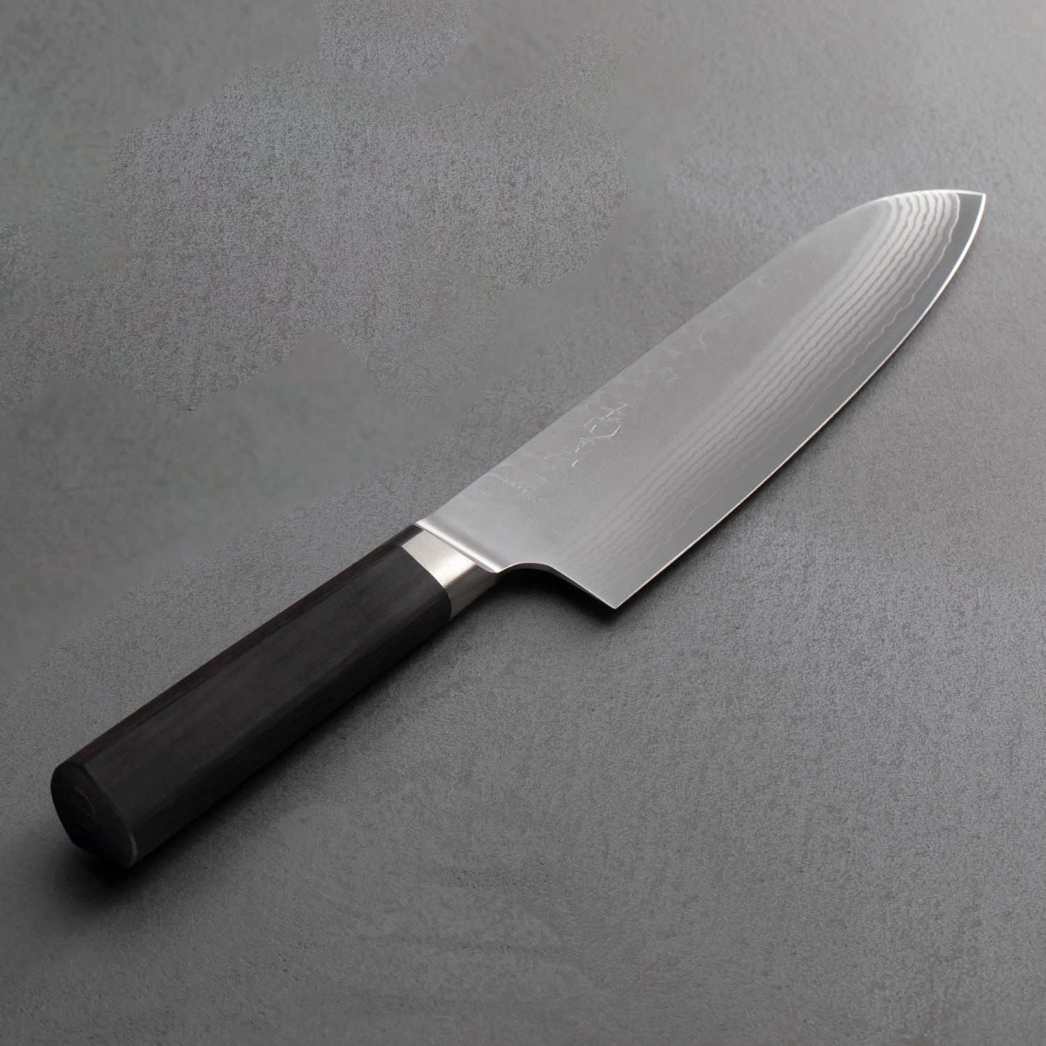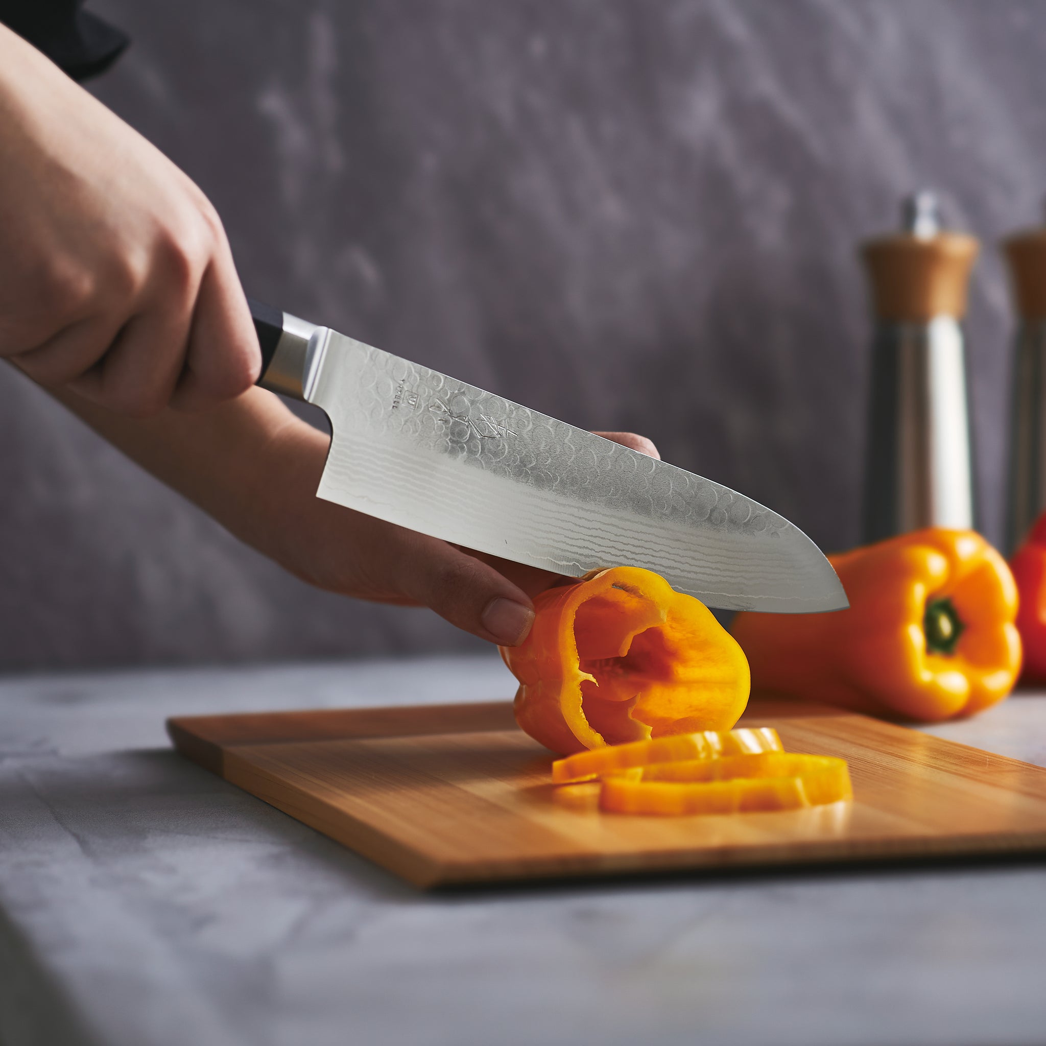 鎚目模様が特長の「37層鋼」。和の要素を感じさせながらも、伝統に寄りすぎない軽やかさと清潔感があるデザインで個性が際立ちます。刃の半分に厚みを持たせているので適度な重みがあり、かぼちゃなど硬い食材が切りやすく、切り離れもよい包丁です。