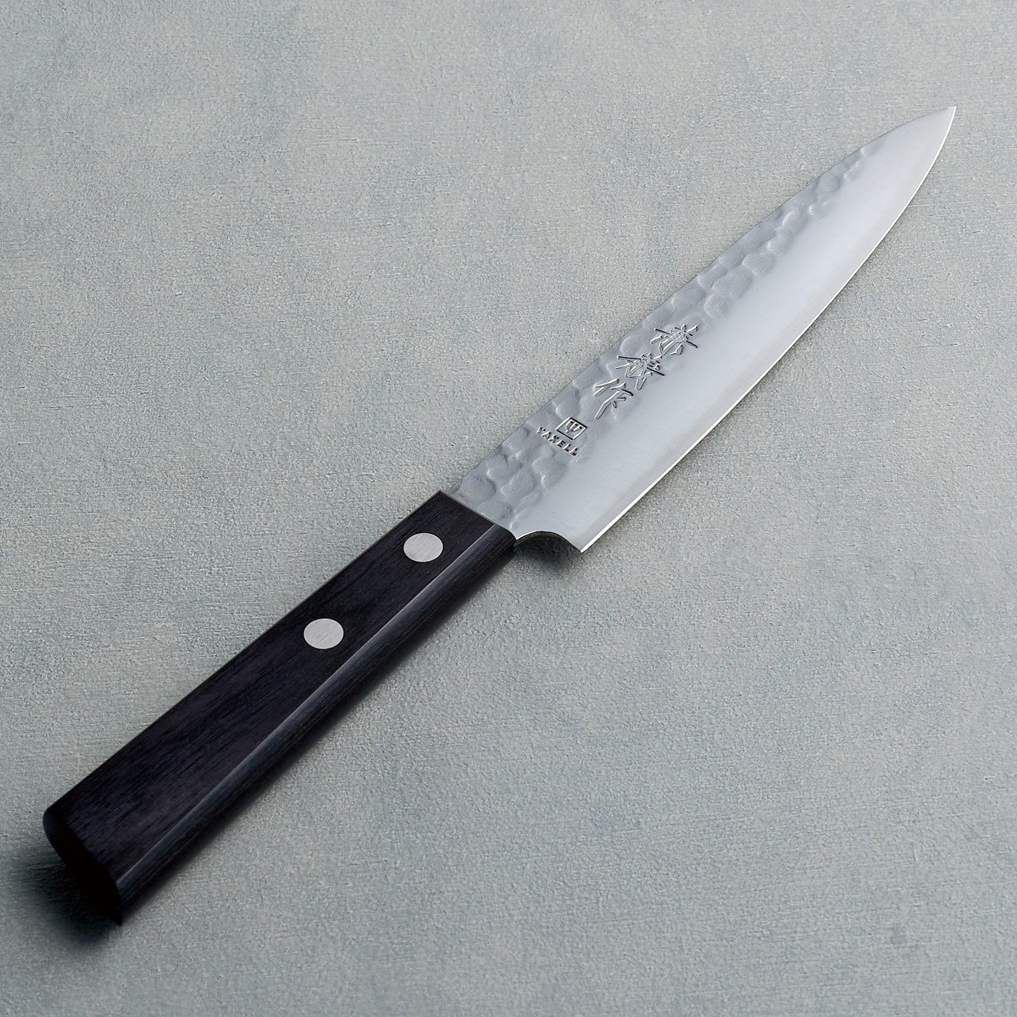 刃渡り13cmのペティナイフ。フルーツなどにはもちろん、小回りがきくので忙しい朝のお弁当づくりや肉・魚を切ることにも使えます。同シリーズで三徳包丁、シェフナイフもご用意しています。