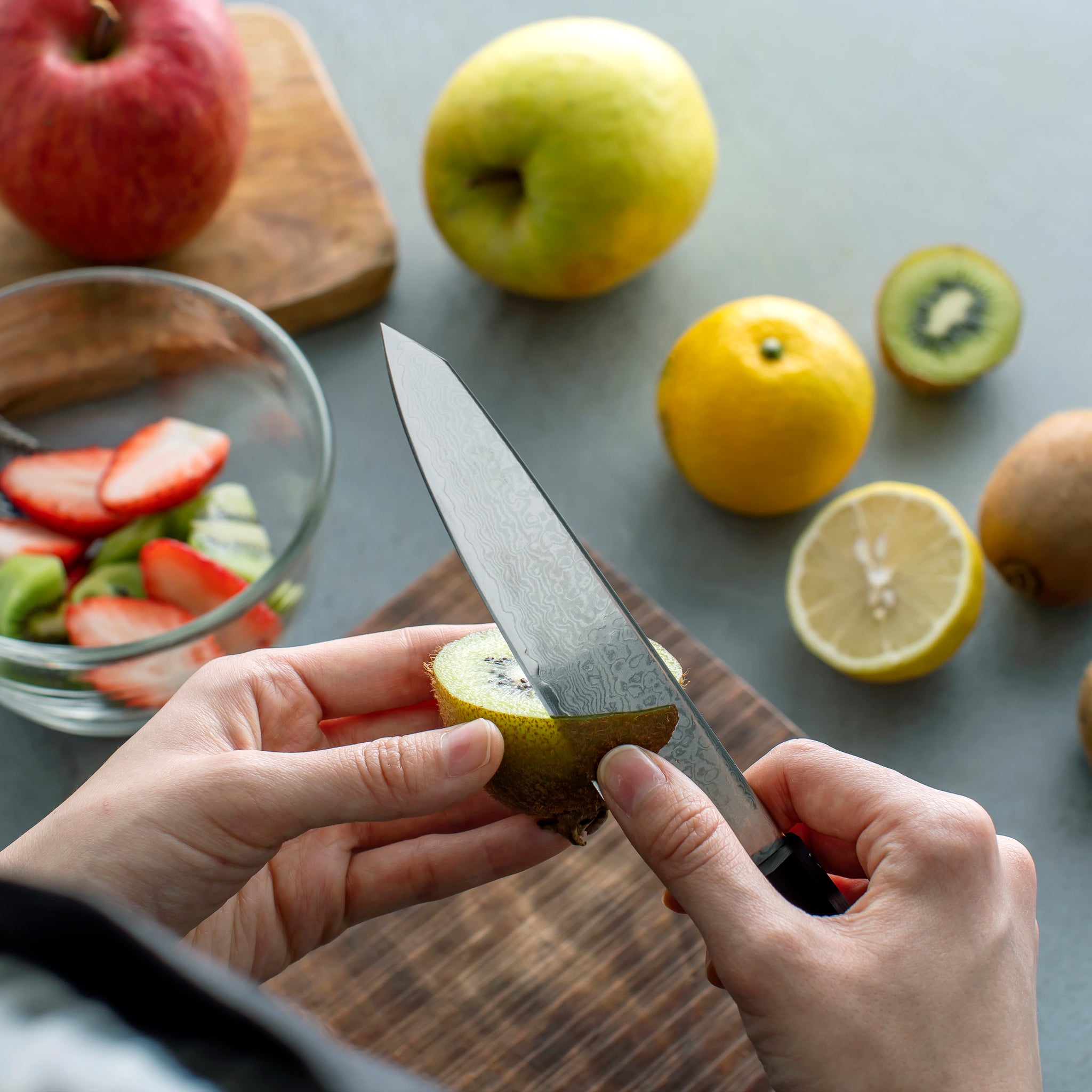 刃渡り13cmのペティナイフ。フルーツなどにはもちろん、小回りがきくので忙しい朝のお弁当づくりや肉・魚を切ることにも使えます。同シリーズで三徳包丁、シェフナイフもご用意しています